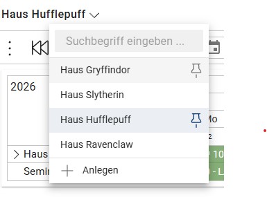 Du kannst den Ressourcenplan wechseln, indem du im Titel auf das nach unten gerichtete Dreieck klickst. Es öffnet sich ein Menü, indem du alle deine anderen Pläne siehst. Über das Eingabefeld kannst du die Auswahl einschränken. Ganz unten im Menü hast du die Möglichkeit einen neuen Plan anzulegen. Durch Klicken des Reißzweck-Symbols, legst du deinen Standardplan fest. Dein aktueller Standardplan ist durch eine blaue Reißzwecke gekennzeichnet und wird für dich geladen, wenn du den Ressourcenplan über das Hauptmenü aufrufst.